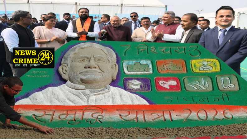 मधुबनी, (न्यूज़ क्राइम 24) मधुबनी जिले में मंगलवार को आयोजित बिहार समृद्धि यात्रा 2026 के दौरान भारत के प्रसिद्ध अंतर्राष्ट्रीय ख्याति प्राप्त रेत कलाकार मधुरेंद्र कुमार की कलाकृति कार्यक्रम का मुख्य आकर्षण बन गई। झंझारपुर के अररिया संग्राम दुर्गा मंदिर परिसर में आयोजित इस कार्यक्रम में मधुरेंद्र कुमार ने विकसित बिहार के सात निश्चय-3 पर आधारित भव्य सैंड आर्ट तैयार की, जिस पर “समृद्धि यात्रा 2026” अंकित था।