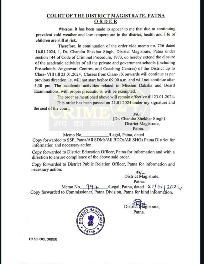 पटना, न्यूज़ क्राइम 24। राजधानी में कड़ाके कि ठंड का कहर को देखते हुए पटना के जिलाधिकारी डॉ चंद्रशेखर सिंह ने सभी निजी, सरकारी विद्यालयों (प्री-स्कूल, आंगनवाड़ी केन्द्रों एवं कोचिंग सेन्टर सहित में वर्ग-8 तक शैक्षणिक गतिविधियों को 23 जनवरी तक बंद करने का आदेश दिया हैं।