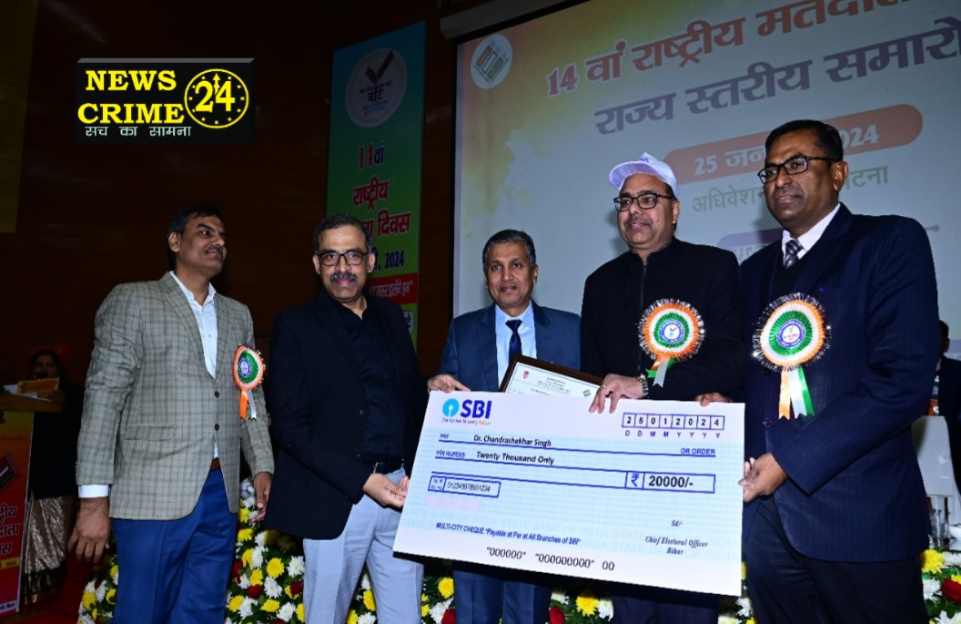 पटना, (न्यूज क्राइम 24) जिला निर्वाचन पदाधिकारी सह-जिलाधिकारी, पटना डॉ चन्द्रशेखर सिंह को आज 14वें राष्ट्रीय मतदाता दिवस के अवसर पर सर्वश्रेष्ठ निर्वाचन कार्यों के लिए राज्य-स्तरीय पुरस्कार से सम्मानित किया गया। मुख्य निर्वाचन पदाधिकारी, बिहार-सह-प्रधान सचिव, निर्वाचन विभाग, बिहार श्री एच.आर. श्रीनिवास द्वारा राष्ट्रीय मतदाता दिवस के उपलक्ष्य में अधिवेशन भवन में आयोजित राज्य-स्तरीय समारोह में जिलाधिकारी को यह पुरस्कार प्रदान किया गया। यह सम्मान सतत अद्यतीकरण एवं विशेष संक्षिप्त पुनरीक्षण, 2024 के दौरान स्वीप गतिविधियों तथा निर्वाचन जागरूकता में उनके नेतृत्व के लिए प्रदान की गई।