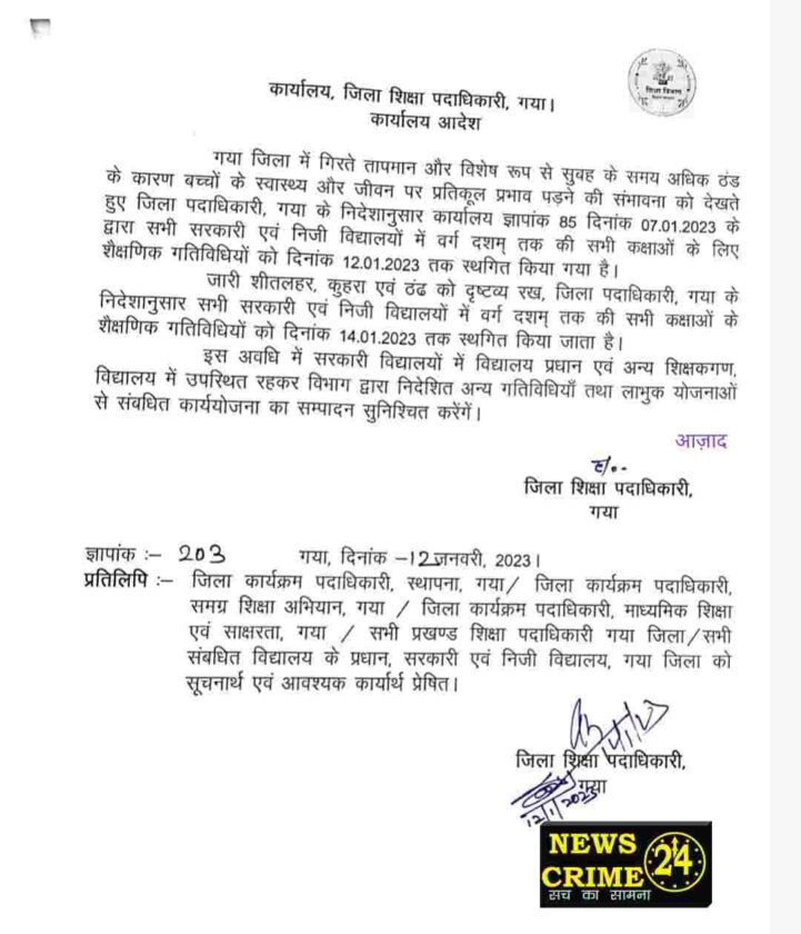 14 जनवरी 2023 तक वर्ग दसवीं तक के सरकारी गैर सरकारी स्कूलों को बंद करने का निर्देश दिया गया है गया जिले में गिरते तापमान और विशेष रूप से सुबह के समय अधिक ठंड के कारण बच्चों के स्वास्थ्य और जीवन पर प्रतिकूल प्रभाव पड़ने की संभावना को देखते हुए डीएम ने यह निर्देश शिक्षा विभाग को दिया है मिले निर्देश पर सभी स्कूलों को सख्त पालन करने का निर्देश मिला है।