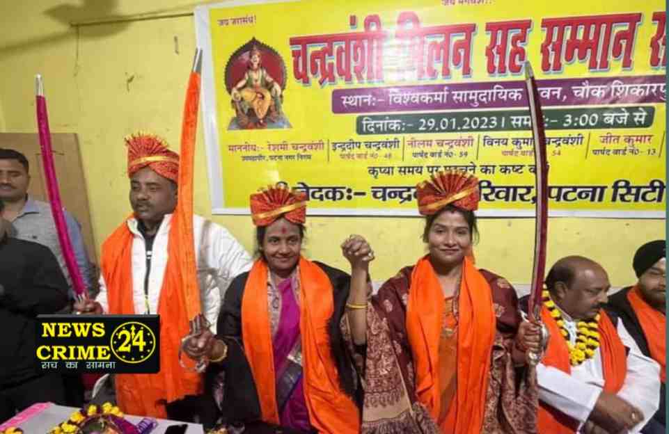 पटनासिटी(न्यूज क्राइम 24): चन्द्रवंशी परिवार, पटना सिटी द्वारा आज विश्वकर्मा मंदिर, चौक शिकारपुर में चन्द्रवंशी मिलन सह सम्मान समारोह का आयोजन किया गया जिसमें डिप्टी मेयर रेशमी चन्द्रवंशी, पार्षद इन्द्रदीप चन्द्रवंशी और पार्षद नीलम चन्द्रवंशी को अंगवस्त्र, पुष्पगुच्छ, सिरोपा और तलवार भेंट कर सम्मानित किया गया।