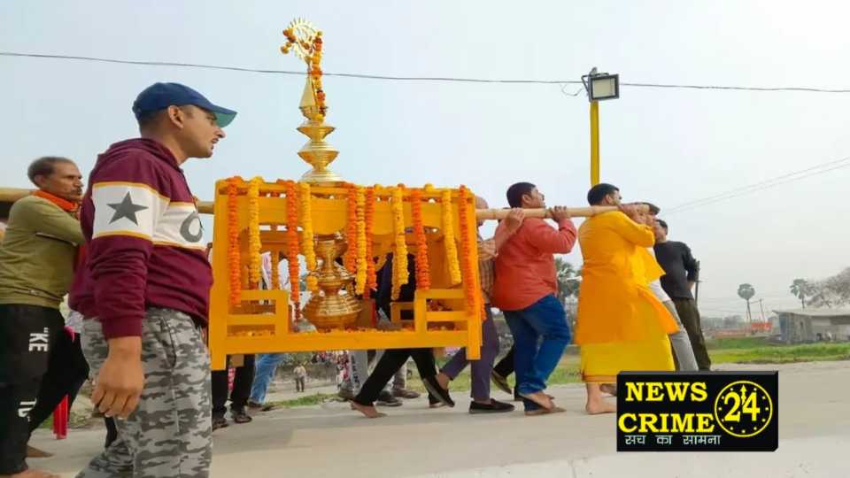 चक-बैरिया में नवनिर्मित सूर्य मंदिर पर गुंबद स्थापना, गांव में निकली धार्मिक शोभायात्रा