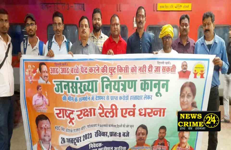 जो बिहार सहित संपूर्ण देश से संग्रहित करोड़ों हस्ताक्षर युक्त मांगपत्र प्रधानमंत्री को सौप कर शीघ्र जनसँख्या नियंत्रण कानून बनाने की मांग करेगी। कहा कि जनसँख्या नियंत्रण पर विश्व में सबसे पहले नीति बनाने वाला भारत संयुक्त राष्ट्र जनसँख्या कोष के अनुसार विश्व का सर्वाधिक आबादी वाला देश बन चुका है जो देश के संशाधनों पर बोझ बढ़ा रही है कहा कि अगर गरीबी, बेकारी और भ्र्ष्टाचार मुक्त भारत का निर्माण करना है तो जनसंख्या के विस्फोटक स्वरूप पर नियंत्रण हेतु सख्त कानून बनाना नितांत आवश्यक है। वहीं प्रदेश महासचिव राजीव झा ,प्रदेश सचिव सुबोध मोहन ठाकुर जिला संयोजक योगेश मंडल ने बताया कि राष्ट्र रक्षा रैली में संपूर्ण देश के साथ अररिया जिले से 35 हज़ार से अधिक हस्ताक्षर युक्त मांग पत्र लेकर बड़ी संख्या में कार्यकर्ता रवाना हुए है। मौके पर दिल्ली रवाना होने वाले कार्यकर्ताओं में राज प्रकाश चौधरी, श्याम सुंदर मंडल, धीरेंद्र साह, नवीन कुमार, दिवाकर कुमार, राजू सिंह हरि साह सहित बड़ी संख्या में फाउंडेशन के कार्यकर्ता मौजूद थे।