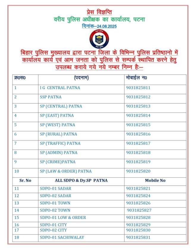 पटना, न्यूज़ क्राइम 24। बिहार पुलिस मुख्यालय ने आम जनता की सुविधा के लिए बड़ा कदम उठाते हुए राजधानी पटना में कार्यरत पुलिस अधिकारियों और थानेदारों के मोबाइल नंबर बदल दिए हैं। इसके तहत आईजी, एसएसपी सहित सभी पुलिस अधिकारियों और थानेदारों के नए आधिकारिक संपर्क नंबर जारी किए गए हैं। अब लोग इन नए मोबाइल नंबरों पर संपर्क कर अपनी शिकायतें दर्ज करा सकेंगे। पुलिस मुख्यालय का कहना है कि इस पहल से पारदर्शिता बढ़ेगी और शिकायत दर्ज कराने में आम लोगों को अधिक सुविधा होगी। नए मोबाइल नंबर जारी होने के बाद पुराने नंबरों का इस्तेमाल अब आधिकारिक कार्यों में नहीं किया जाएगा। पुलिस मुख्यालय ने आम जनता से अपील की है कि वे किसी भी समस्या या आपात स्थिति में नए जारी नंबरों पर ही संपर्क करें।