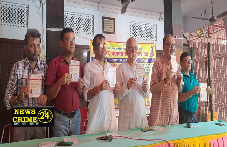 पटनासिटी(न्यूज क्राइम 24): भगवान श्री कृष्ण की कृपा से श्रवन मास एवं अधिक मास के शुभ अवसर पर साधन धाम छोटी पटन देवी गली में श्री मद्भागवत सप्ताह ज्ञान यज्ञ एवं सवा लाख पार्थिव शिव लिंग निर्माण पूजन रुद्राभिषेक का दिव्य एवं भव्य आयोजन किया जा रहा है।जिसमे कथा व्यास पूज्य श्री चंदन कृष्ण शास्त्री जी है, यह बाते आज साधन धाम में प्रेस वार्ता में अनन्त अरोड़ा, सुरेश अरोड़ा, मनीष अग्रवाल, राजकुमार तिवारी, गौतम बिजपुरिया, सरज कपूर ने संयुक्त रूप में दी। वहीं इस अवसर पर आमंत्रण पत्र का भी विमोचन किया गया। यह आयोजन 14 जुलाई से 21 जुलाई तक होगा। इसमें सैकड़ों भक्त कृष्ण रस में डूबेंगे।
