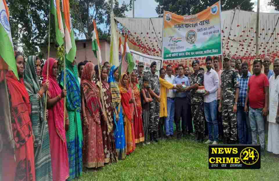 अररिया, रंजीत ठाकुर। एसएसबी 56वीं वाहिनी मुख्यालय बथनाहा के अधिकारी व जवान जहां एक ओर भारत नेपाल सीमाओं की सुरक्षा में तैनात रहते हैं, वहीं दूसरी ओर नागरिक कल्याण कार्यक्रम व अन्य जागरूकता कार्यक्रम समय-समय पर चलाया जाता है। इसी कड़ी में 01 सितम्बर 2023 से 30 सितम्बर तक वाहिनी के कार्यक्षेत्र अंतर्गत सभी गांव के प्रत्येक घरों से नियमित रूप से मिट्टी एकत्रित की जा रही थी। सभी गांव से एकत्रित की गई मिट्टी को आज शुक्रवार 06 अक्टूबर 2023 को कमांडेंट सुरेंद्र विक्रम के नेतृत्व में कुर्साकाटा प्रखंड अंतर्गत आने वाले गांव से मिट्टी को स्थानीय ग्रामीनों, जनप्रतिनिधियों व नेहरू युवा केंद्र संस्थान अररिया के जिला युवा अधिकारी श्री सत्य प्रकाश यादव सहित अन्य वॉलिंटियर्स के साथ अमृत कलश यात्रा के माध्यम से कुर्साकांटा प्रखंड में पहुंच कर किया गया कार्यक्रम का आयोजन।