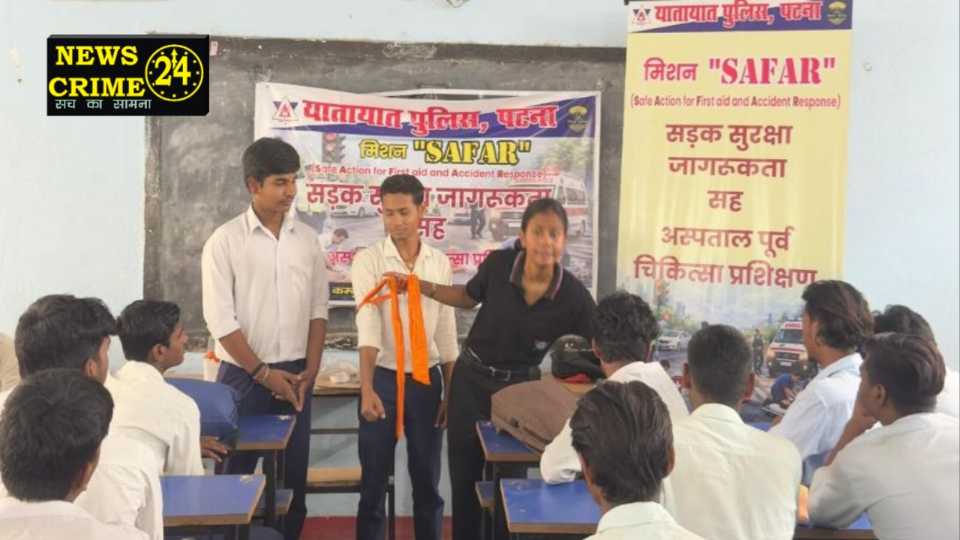 पटना, (न्यूज़ क्राइम 24) यातायात पुलिस अधीक्षक सागर कुमार के मार्गदर्शन में सोमवार को द्वारिका उच्च माध्यमिक विद्यालय, मंदिरी, पटना में कम्युनिटी ट्रैफिक पुलिस द्वारा “मिशन SAFAR (Safe Action for First Aid and Accident Response)” के अंतर्गत सड़क सुरक्षा विषय पर एक रोचक एवं शिक्षाप्रद कार्यक्रम का आयोजन किया गया। कार्यक्रम का मुख्य उद्देश्य छात्र-छात्राओं को यातायात नियमों की जानकारी देना एवं उन्हें सुरक्षित सड़क व्यवहार के प्रति जागरूक बनाना था। इस दौरान सड़क सुरक्षा जागरूकता, अस्पताल पूर्व प्राथमिक उपचार (फर्स्ट एड) तथा ट्रैफिक गेम जैसी गतिविधियों का आयोजन किया गया।