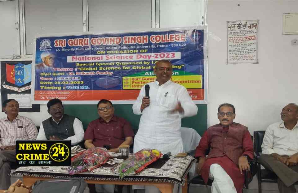 पटनासिटी(न्यूज क्राइम 24): प्रभारी प्राचार्य प्रो०(डॉ०) कनक भूषण मिश्र के नेतृत्व में महाविद्यालय के पुस्तकालय भवन में विज्ञान दिवस का आयोजन बहुत ही हर्षोल्लास से संपन्न हुआ। आज के इस पावन अवसर पर मुख्य वक्ता के रूप में डॉ बैकुंठ पाण्डेय जी पूर्व प्राचार्य राजेंद्र महाविद्यालय, छपरा ने भाग लिया। इस अवसर पर सर्वप्रथम अतिथियों का परिचय कराया, तत्पश्चात प्रभारी प्रधानाचार्य के द्वारा मुख्य अतिथि डॉ बैकुंठ पाण्डेय, पूर्व प्राचार्य को शाल तथा पुष्पगुच्छ देकर स्वागत किया गया। महाविद्यालय के प्रभारी प्राचार्य को आइ.क्यू.ए.सी के समन्वयक डॉ विकास कुमार ने पुष्पगुच्छ देकर स्वागत किया। कार्यक्रम का श्री गणेश मुख्य अतिथि तथा प्रभारी प्राचार्य प्रो (डॉ०) कनक भूषण मिश्र के द्वारा दीप प्रज्वलित कर प्रारंभ हुआ।