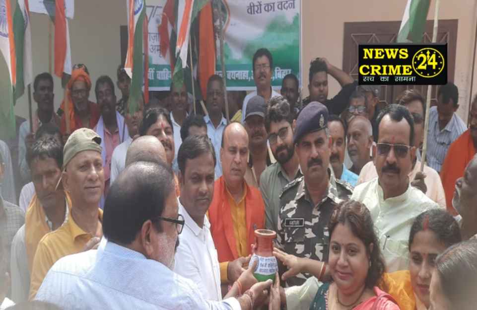 अररिया, रंजीत ठाकुर। बताते चलें कि 56वीं बटालियन सशस्त्र सीमा बल बथनाहा के अधिकारी व कार्मिक जहां एक ओर भारत नेपाल सीमाओं की सुरक्षा में तैनात रहते हैं वहीं दूसरी ओर नागरिक कल्याण कार्यक्रम व अन्य जागरूकता कार्यक्रम समय-समय पर इनके द्वारा चलाया जाता है। इसी कड़ी में दिनांक 01.09.2023 से 30.09.2023 तक वाहिनी के कार्यक्षेत्र अंतर्गत सभी गांव के प्रत्येक घरों से नियमित रूप से मिट्टी एकत्रित की जा रही थी। सभी गांव से एकत्रित की गई मिट्टी को आज दिनांक 11.10.2023 दिन वुधवार को 56वीं वाहिनी के कमांडेंट सुरेंद्र विक्रम के निर्देशन में फारबिसगंज प्रखंड के अंतर्गत आने वाले गांव से एकत्रित की हुई मिट्टी को स्थानीय ग्रामीनों, जनप्रतिनिधियों, डाक विभाग, अन्य सहयोगी संस्थाओं व नेहरू युवा केंद्र संस्थान अररिया के वॉलिंटियर्स के साथ अमृत कलश यात्रा के माध्यम से फारबिसगंज प्रखंड में पहुंच कर किया गया कार्यक्रम का आयोजन।
